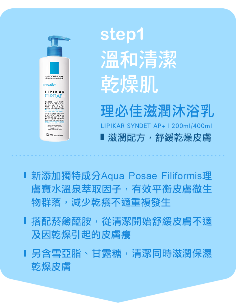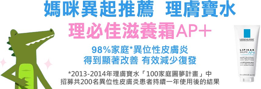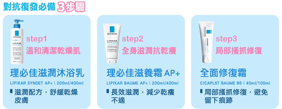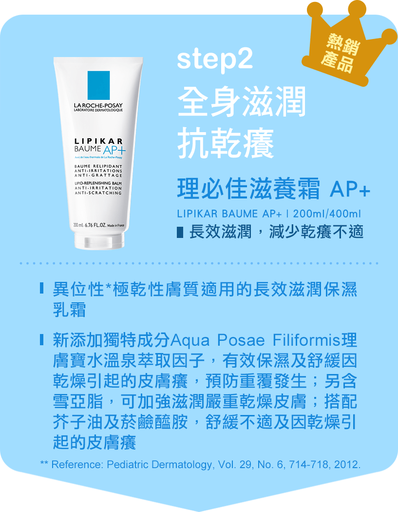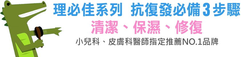 照顧小秘訣: 每天用理必佳滋潤沐浴乳洗澡後,趁身體還濕濕的擦上滋養霜AP+乳液,局部搔抓部分塗抹上全面修復霜,促進皮膚修復,有效跟癢癢說掰掰!